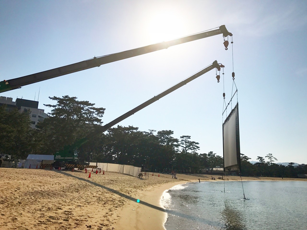 スクリーンは2台のクレーン車でつりさげられている 浜辺には木製のベンチが用意されているが、多くの観客は砂浜にレジャーシートなどを敷いて座り、飲食をしたりしながら、楽な姿勢で映画を鑑賞することになる。映画は午後6時半からの上映開始が予定されていたが、その時間は日没前で映画を見るにはまだ少し明るい。そのため、上映開始は午後7時からに繰り下げられた。