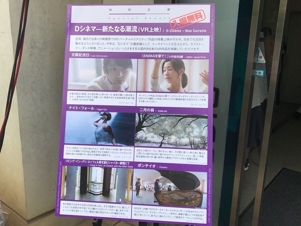 埼玉県川口市で開催中のSKIPシティ国際Dシネマ映画祭2017で16日から18日まで、VR(バーチャルリアリティ)作品6本を無料で見ることができる特別企画「Dシネマ—新たなる潮流」があった。各日4回の入場機会があり、1回50分で定員20人の開催だったが、多くの回で満員となった。参加者はVRヘッドセットを装着して、360度の仮想空間を堪能した。