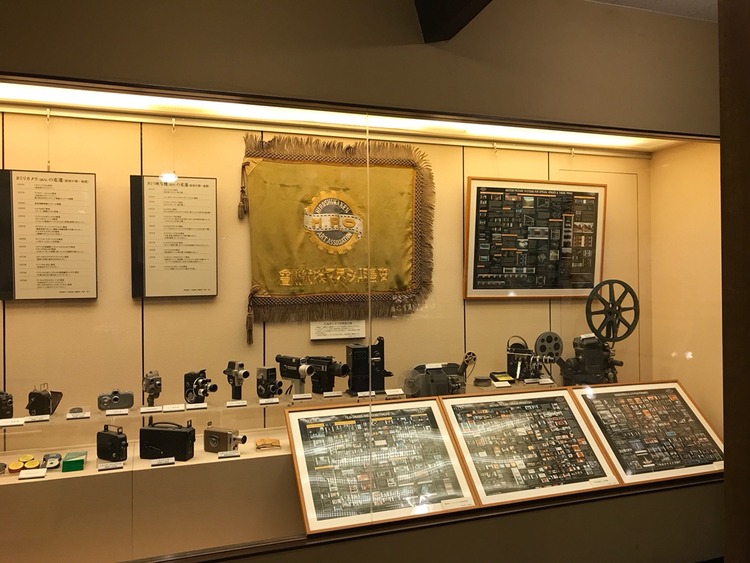 入口を入って右側には、8ミリカメラと8ミリ映写機の変遷を示した年表、かつて使われていた8ミリカメラと8ミリ映写機、広島県シネマ技術協会旗などが陳列されている。