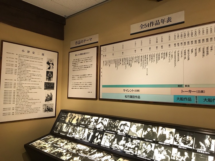 小津安二郎の年譜、作品のテーマ、全54作品の年表、小津の映画作りの特徴がパネル展示されている。また、各作品のスチール写真も見ることができる。表記は日本語だけで英語対応はしていない。
