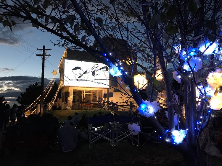 徐々に日が暮れてくると、明るいスクリーンや世界観を表現するための光る装飾が夜空に映えるようになってくる。参加者たちは飲食をしたり、友人たちと語り合ったりと、映画上映を待ちながら、幻想的な空間を楽しんでいた。
