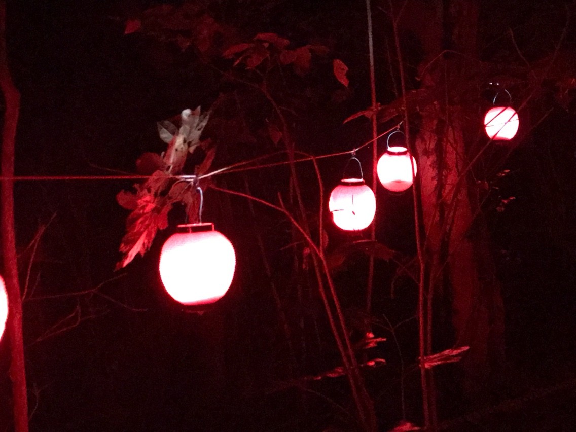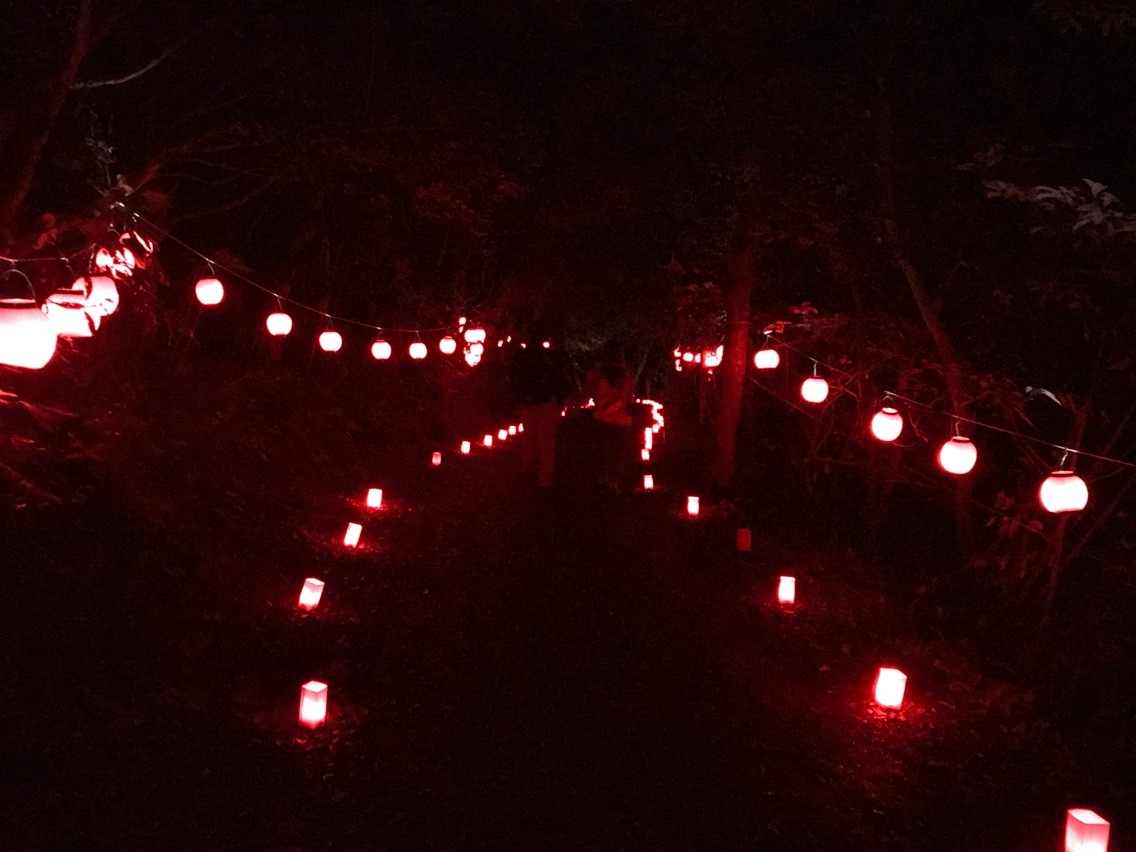 歩道の脇には小さなランタンがたくさん置かれている。これは森の映画祭の名物のひとつであり、暗い夜道を参加者が移動する際の誘導灯の役目を果たす。明るいうちは目立たないが、暗くなってくると、空港の誘導灯のように光る。参加者はランタンの光に導かれながら、会場間を移動することができる。
