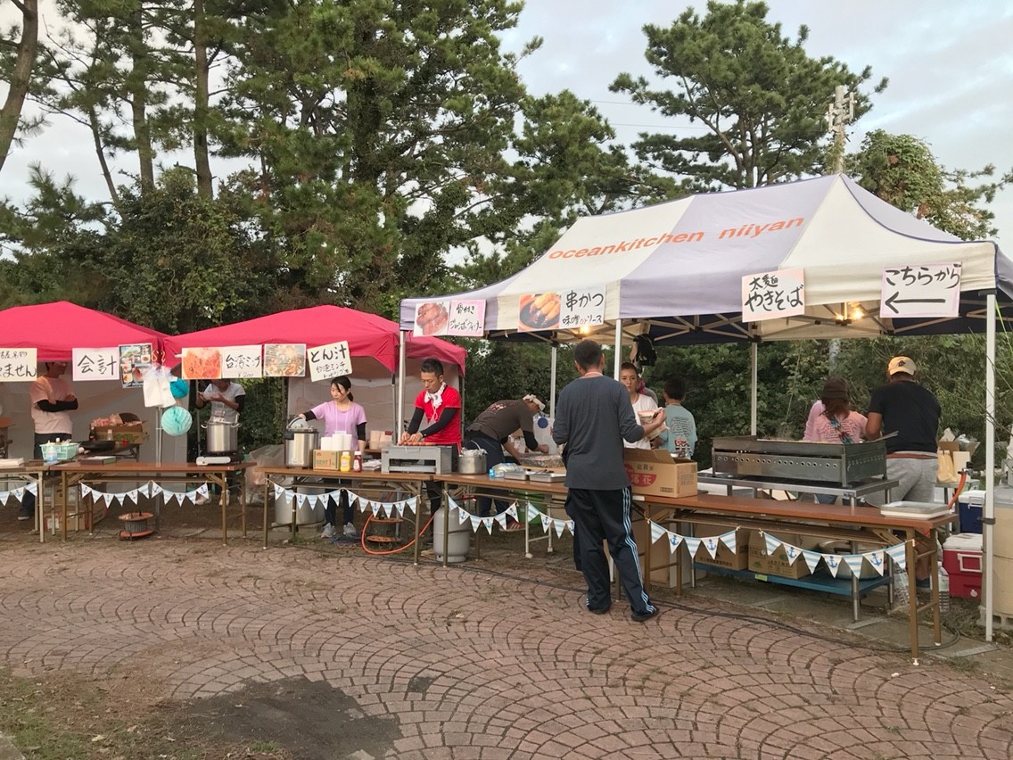 野外での映画上映には飲食物は不可欠だ。それぞれの会場にはオフィシャルのドリンクブースや、佐久島や佐久島にゆかりのある様々な店のブースが出店している。また、島内の既存の飲食店も営業時間を延長して参加者にサービスを提供している。