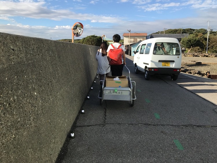 島内で荷物を運ぶ