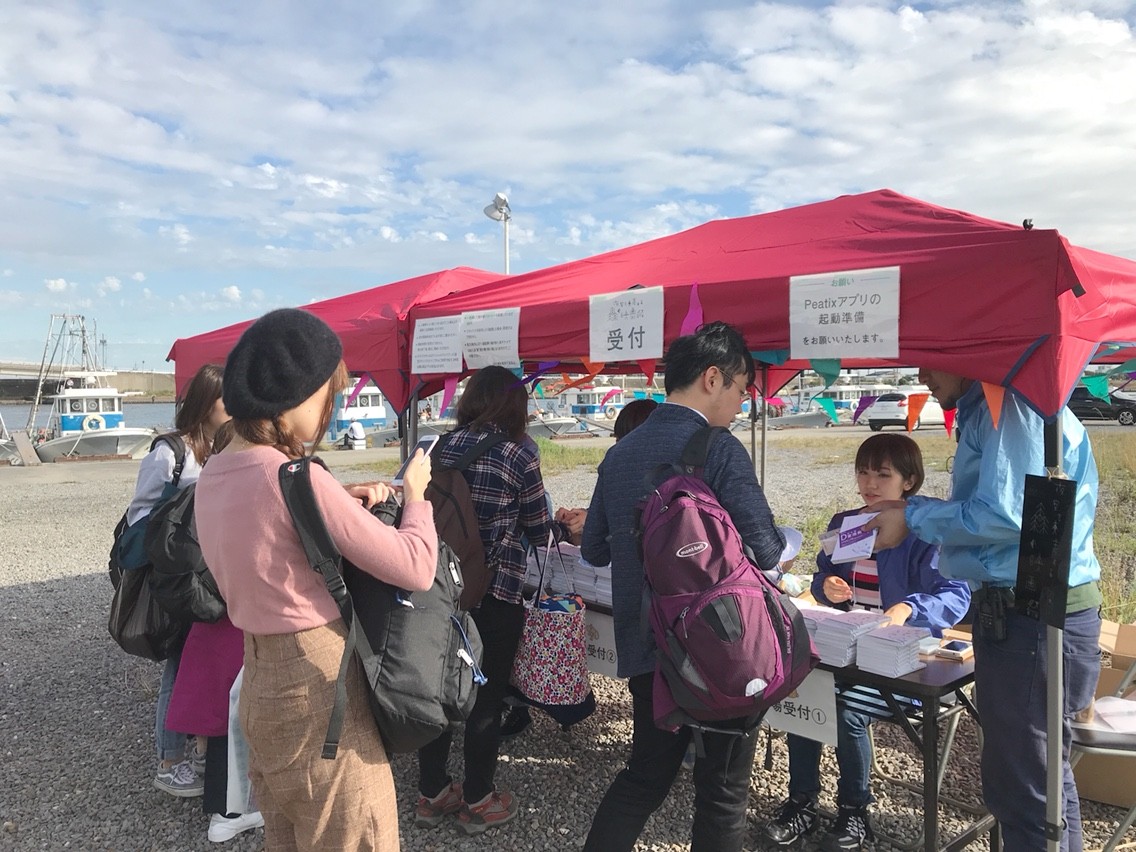 船乗り場の近くには映画祭の受付テントが設営されている。参加者は連絡船に乗る前に受付を済ませるようになっている。参加チケットはアプリを使ってスマートフォンにダウンロードされる仕組みになっており、スマホの画面を示して手続きをする。