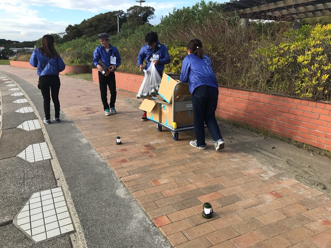 歩幅で間隔を測りながらランタンを並べていくスタッフたち