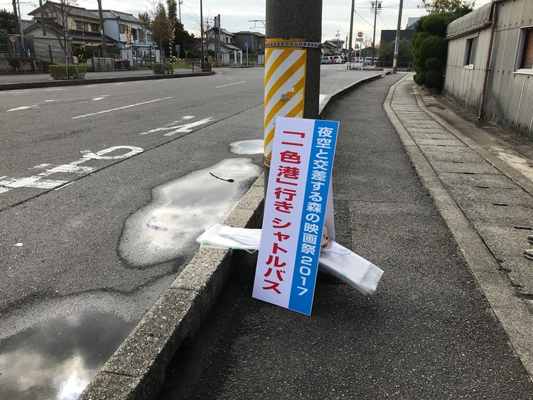 電車を降りて改札口を出ると、駅前には映画祭専用の一色港行きシャトルバスの乗車場所を示す看板が設置されていた。シャトルバスの利用には事前申し込みが必要だが、時間指定したバスには予約者全員が乗車できる。