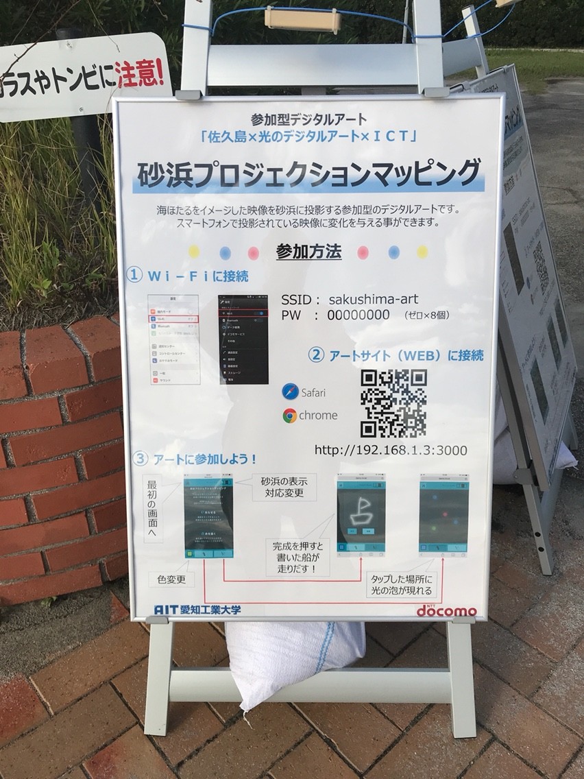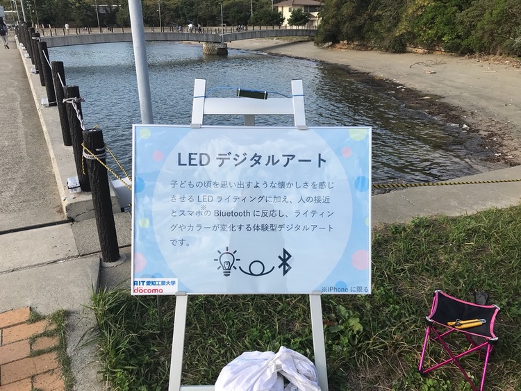 今回の映画祭では、西尾市佐久島振興課、愛知工業大学情報科学部水野慎士研究室、NTTドコモによる参加型の光のデジタルアートが展示されている。森の映画祭のテーマである「しゅわしゅわ」と佐久島をテーマに、砂浜に映像を投影する「砂浜プロジェクションマッピング」と人などの接近に反応してライティングや色が変化する「LEDデジタルアート」が展示された。