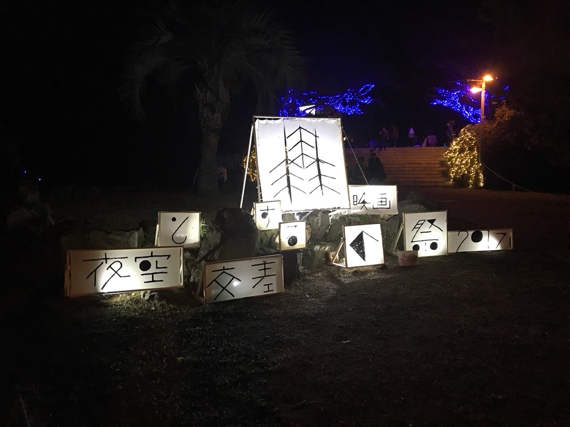 暗闇に浮かび上がる映画祭の看板