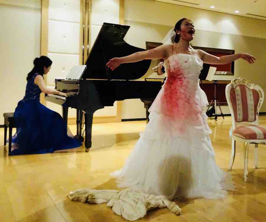 結婚式の最中、望まない政略結婚相手の新郎を刺したルチア役の坂井は、血しぶきの飛んだウエディング姿で登場。狂乱の様相で高らかに歌い上げた。折しも、このコンサートの会場は、普段は結婚式の披露宴会場として使用されている。鬼気迫るウエディングドレス姿で歌う様子が印象深かった。